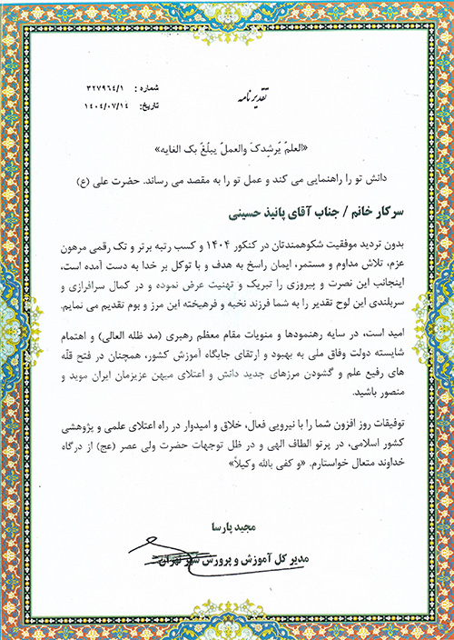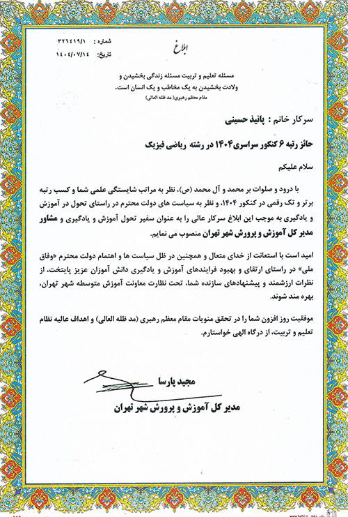 🌟 تقدیر از پانیذ حسینی، تنها دختر تک‌رقمی رشته ریاضی کشور در پنج سال اخیر