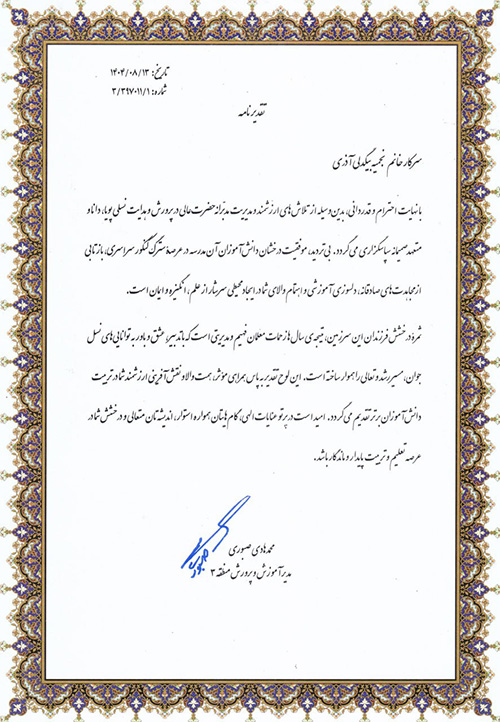 «افتخارآفرینی شما دانشآموزان برتر، حاصل زحمات مستمر، همکاری خانوادهها و حمایت مجموعه آموزش و پرورش منطقه است. آینده روشن کشور به دستان توانمند و اندیشههای شما رقم خواهد خورد.»